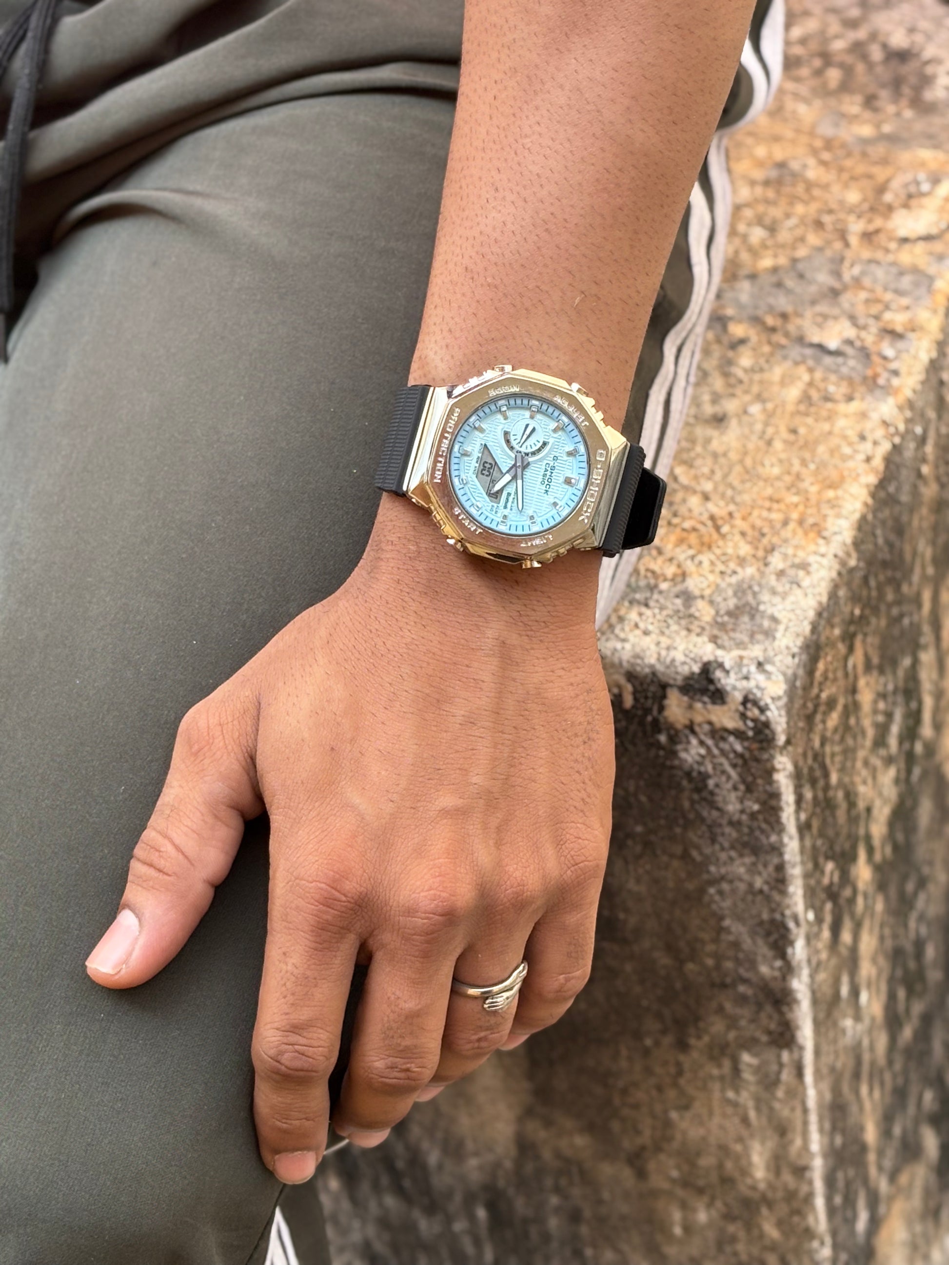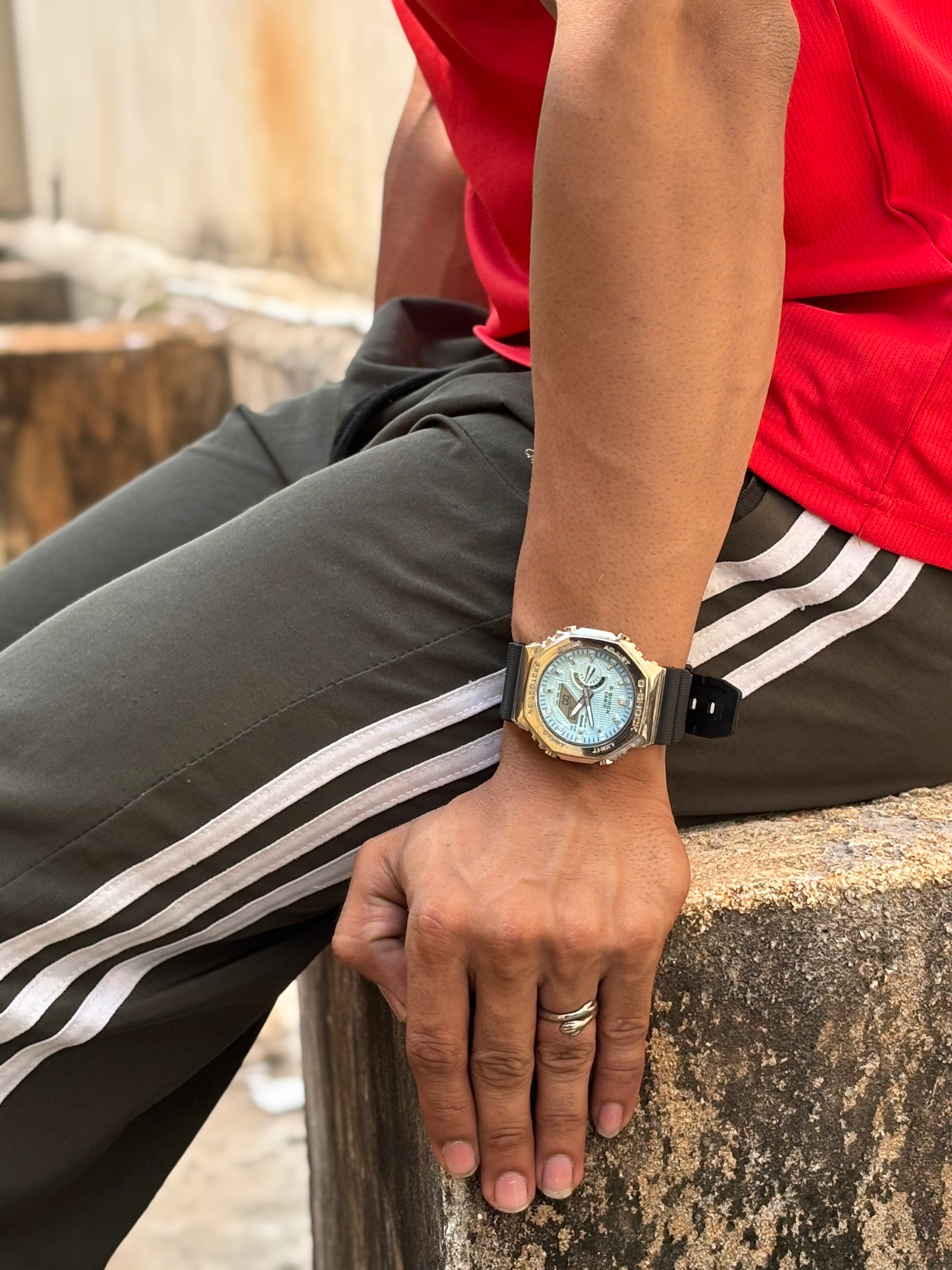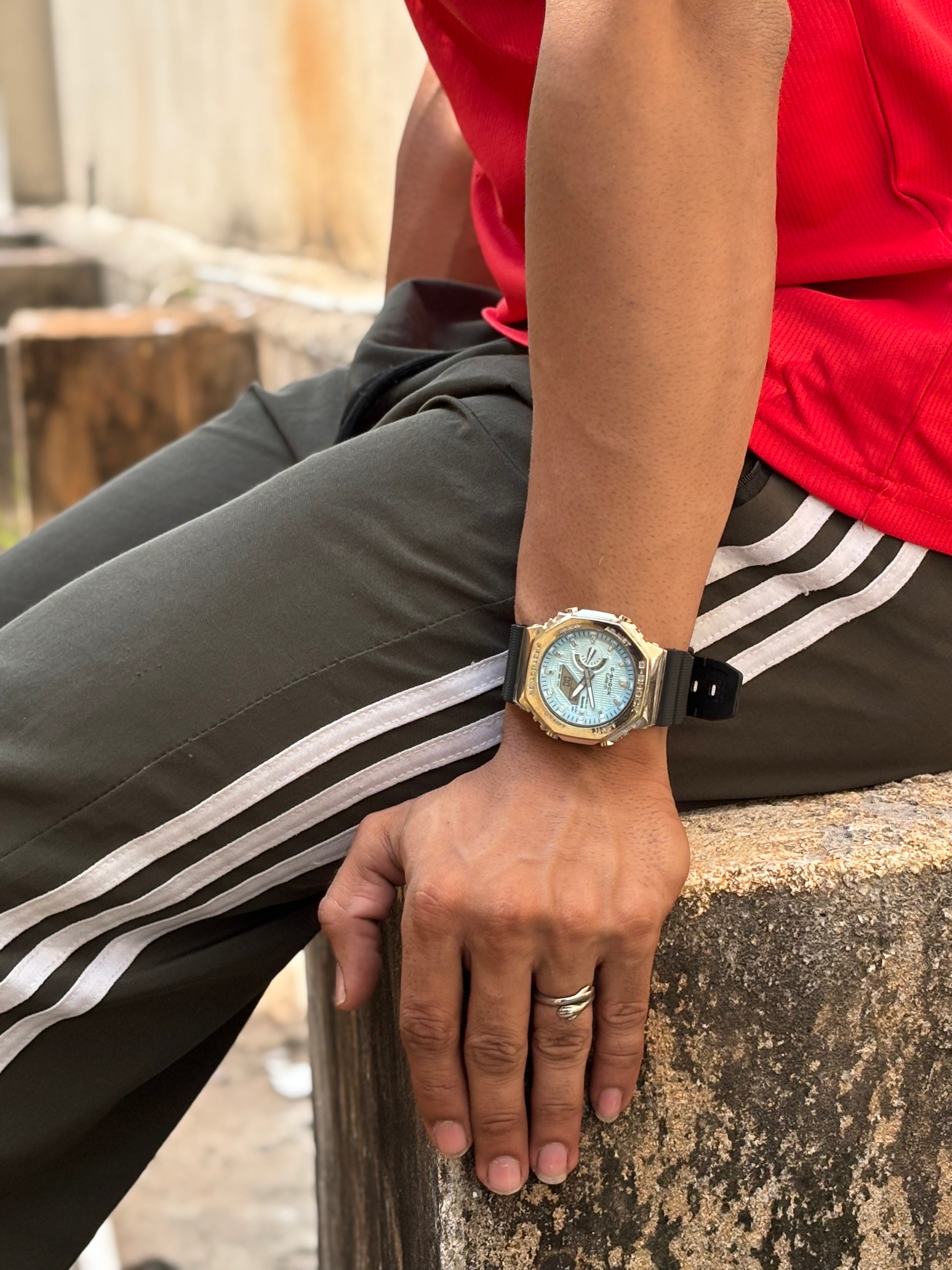 Tough, stylish, and functional — this G-Shock analog-digital watch combines a green dial with a metal bezel for a bold look. Built for durability and performance, it’s perfect for travel, sports, and everyday wear.